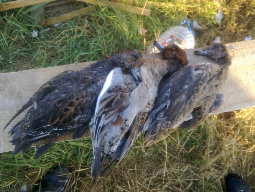 были с другом в пятницу на охоте результат вечером у меня два крыжня у друга чирок и шилохвость!причем когда начали потрошить уток в обоих крякавных в зобу хлеб(летели стаей штук семь выбил двух)где они его отрыли)))мож с парка летели!!!утренний результат на фото!погода супер...за заднем плане на фото подсадные