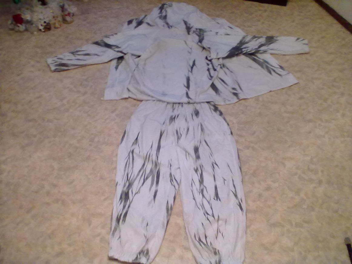 а у меня был обычный х/б белиЙ-белиЙ... я его скомкал небрежно и балончиком для покраски обуви типа саламандер, пшикнул на него пару раз и получился х/б костюм "клякса"... ничего так смотрится, прикольно.