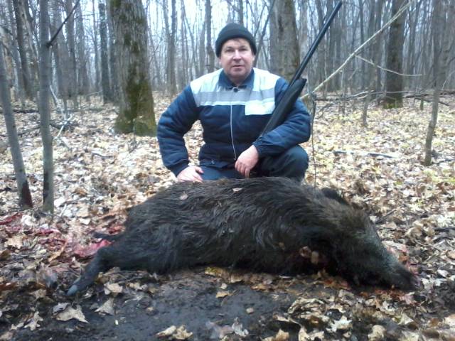 Вот еще маленько повезло.Дело было 30 ноября.Шигоны.Всю ночь шел снежок.Утром выехали.Погода-чудо!Зайцы напрыгали.Но наш объект ХРЮН.Почти сразу наткнулись на свежий заход-свинка с поросятами.Едем дальше.Еще заход два кабана.Едем дальше.Свежайший заход кабаний-секачок.Расставили номера быстренько,мы в загон двое с собаками.Лежал в 50 матрах от нас,едва собак пустили они сразу залаяли.Слышим выстрел.По рации сообщили что кабан прошел,промахнулись.Стреляли с чезетки с оптикой метров 80 ,но промах. Снова делаем оклад-ваыхода нет.Собаки выбегают ,у одной разорван бок.Решили чайку попить.Раненого в машину.Решили сделать повторный загон.Я встал на след,остальные с противоположной стороны леса.Едва егерь зашел с собаками в лес -слышу крик типа(караул),собака заорала.Оказалось хрюн лежал в 30-метрах от места нашего чаепития и все подслушивал.Но передать сведения своим собратьям было ему не суждено.Вышел на хорощего стрелка с ТГРОМ 7,62х54 и получил пулю в шею.Лег на месте.Егерь сказал что бросился на него в загоне,собака выручила.http://samarahunter.ru/forums/attach...1&d=1356348981