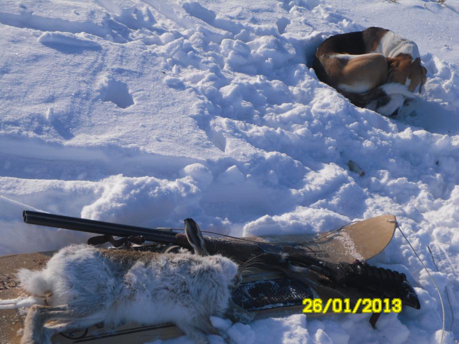 Вчера даже особо ни на что не надеялсь.Но закрываться надо-потом работа...Снега долго не было,морозец хороший.Но встав на вроде бы несвежий след,который потом пересекся со свежим,поднял зая.Встал далековато-небольшая корочка наста.Но на ходы расставились правильно-выскочил на товарища.Потом увидели скидку в бурьян.Только сунулись с дороги в сторону скидки,вылетает в лоб-готов!Уходит только дорогами,в бурьян ложится рядом с дорогами.Глубоко и тяжеловато ему там ходить.Случайно,идя по дороге,наткнулся на свежую скидку.Лежал в 10 м от скидки-тоже готов,но чей-то подранок.Палец на задней лапе отстрелян и в лапе дробина.Итог 3:0 в пользу настойчивых.