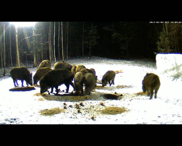 да обычный там фонарь на столбе, зверь к нему привыкает и не боится (если его там сильно не беспокоят), скорее всего эта площадка для подсчета поголовья, зверя на ней не стреляют.