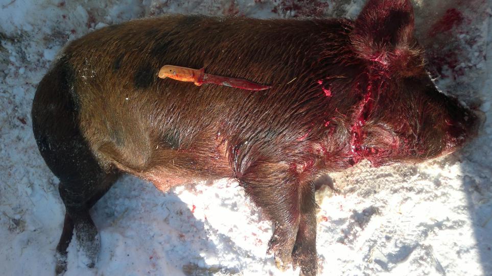 Разрез громадный, от уха до уха. У нас обычно см 6-7, опаливать легче и сало с шеи не плавится.