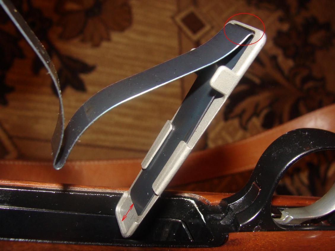 Опять открываю крышку и что там наблюдаю: фото №1 - прижуна сдвинута вперед, в таком положении подача не происходит в 8 случаях из 10 (пружина толкает нос патнона, затвор чуть касается донца и проскальзывает, не подавая его);