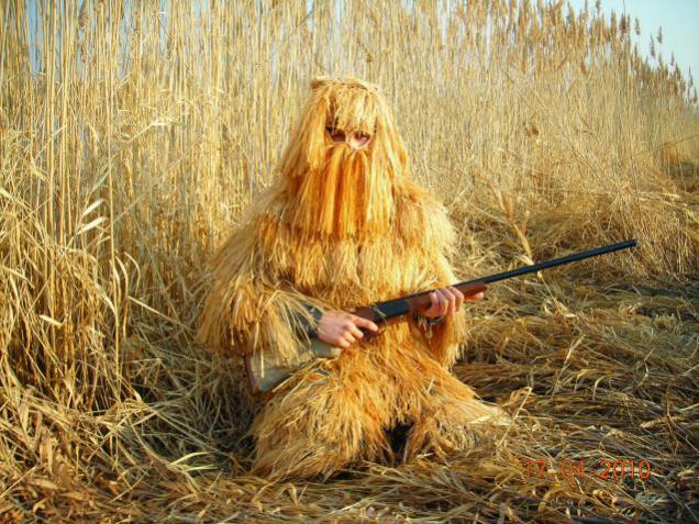 В эти выходные первый раз охотился в магазинном "лешем". Так и не смог приспособиться : мое мнение , что в нем конечно тебя почти не видно , но и сам не видишь ни хрена. Солома лезет в глаза , закрывает весь обзор , при вскидке ружье ложится не в плечо а куда попало. Зато когда стал им просто накрываться , стало намного удобней - при налете стаи полог просто скидываешь и стреляешь, хочешь сидя , если успеваешь вскакиваешь.