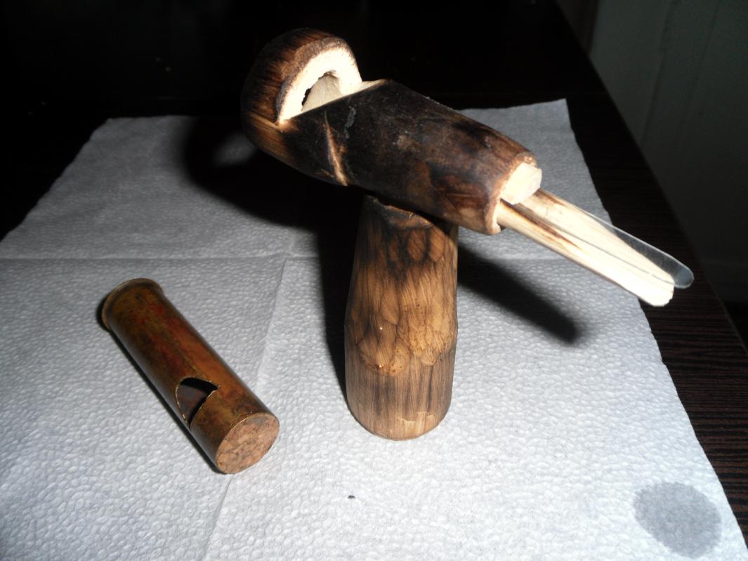 2. Изготовление манка из сухого дерева, теперь идет обработка огнем, морилкой, лаком.( по желанию)