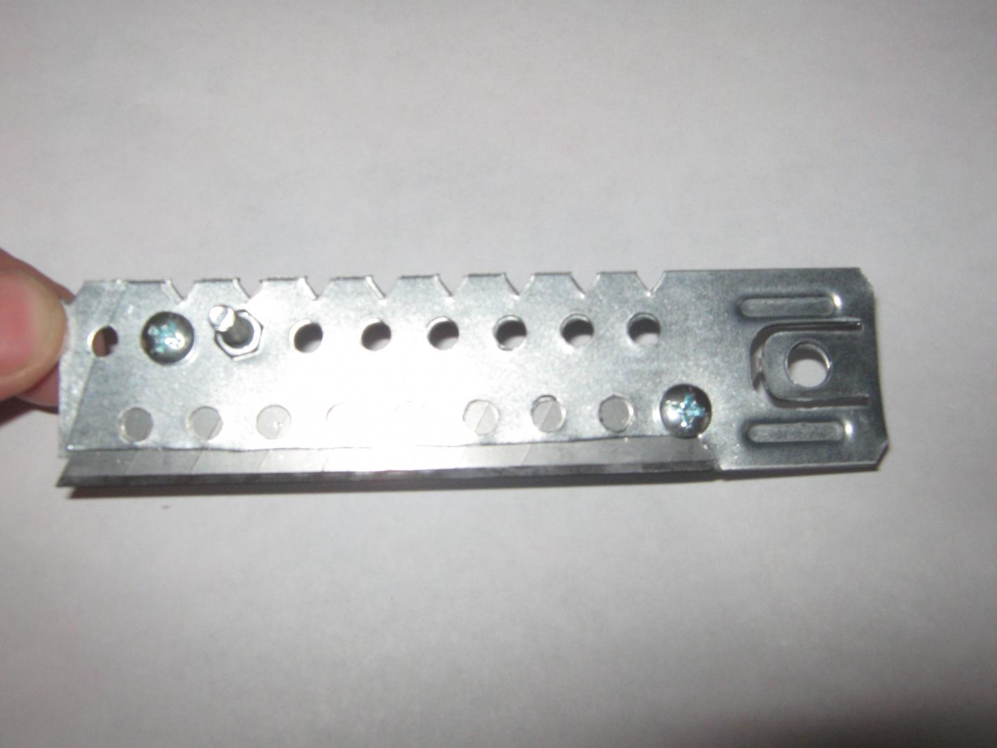 Понадобится: 1.Хрень 2.Болты 3шт на М5 с гайками. 3. Лезвие от канц ножа. Обрезаем по краям монтажную ХРЕНЬ по120мм. Собираем на три болта М5. Рекомендую лезвие заклеить куском изоленты ( ибо ТБ). Последний раз редактировалось кефир; 17.09.2013 в 11:49. |