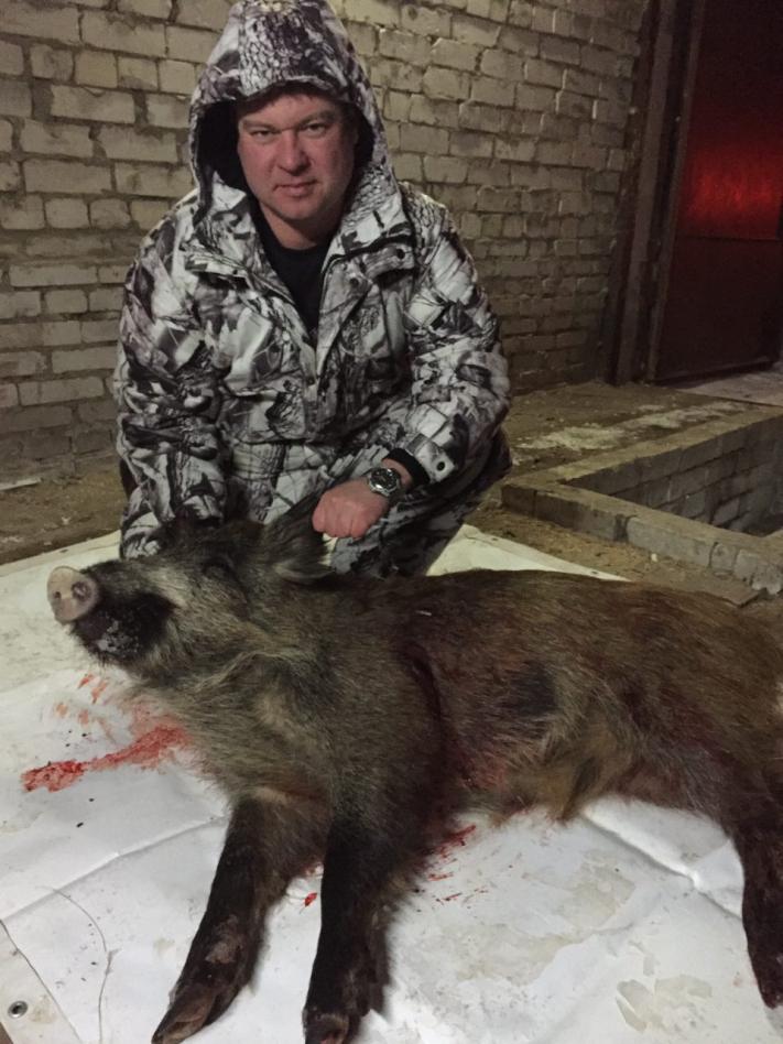 Итак ситуация: Вы на вышке, выходит табунок. Свин большой и пять малых. Все малые одного размера. Времени 01.50, луны нет, т.е. полная темнота. По логике свинья с поросятами. Учитывая условия рассмотреть сложно. Дожидаемся удобного момента, стреляем одного из малых. Лежит на месте, ибо "девятка не живит". Идем подбирать - оба на ! (( Свинья, 2,5 года, кил 90. Стоп приехали...