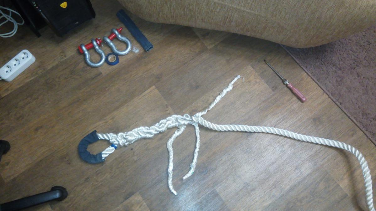 Приобрел я себе полиамид 22мм и пару шаклов тоже 22мм (4,75 т). Каната брал 11 метров, на заплет ушло по 2*70 см + петли в итоге рабочих осталось 9,5 грубо метров