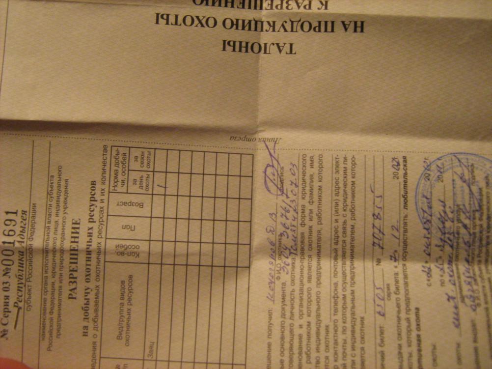 Вернулся с Краснодарского края, а точнее с Адыгеи, так как жил на границе! Погода скажем так весна +8, поэтому на зайца просто чернотроп, без собакена там делать нечего, хотя на зайца наступил.....но не попал , потому как бежал в сторону садящихся на пруд гусей (в дальнейшем бакланы) - Новый год короче!![]() В один из дней выпал снег (о чудо) естественно я уже с ружьем в поле, а дальше не поверите, такое ощущение, что все зайцы вышли посмотреть на снег, стоко следов я не видел, троприть без толку, а к вечеру снег растаял! А вот и сама путевка - в принципе халява, хотя её там редко кто берет! |