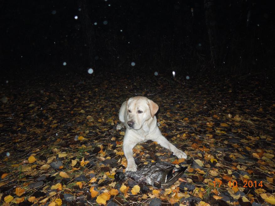 Вечером,уже в сумерках,пара уток свернула на манок.Одна чисто бита-упала в воду,другая ушла лёгким подранком.Спикировала она далеко и тоже в воду,я и собаку посылать за ней не стал.Пёс наплавался в ледяной воде,завтра с утра попробуем добрать,если норка не опередит. Видимо северная утка,одета уже по-зимнему.
