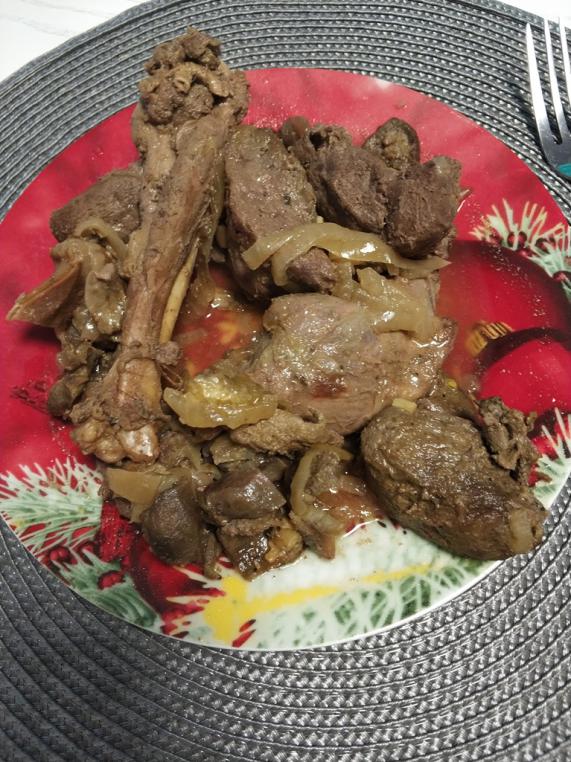 Один из гусей при добыче сильно "пострадал", пришлось снимать и шкуру и разделать его на куски. Попутно с трех гусей и одного селезня добавил потрошки (их отварил предварительно 20 мин.). Далее все это обжарил с луком и уложил в глиняный горшок еще на 1 час в духовку, специи только соль и перец, сухое вино белое. Далее можно добавить к любому гарниру, ум отъешь! Я так ем!)))