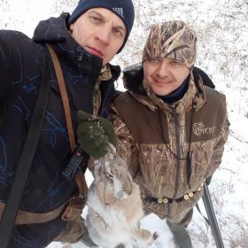 Тоже сегодня уехали в угодья, не сдержались. Хоть и погода не благоприятствовала, ветрище ужасное. Прошли 8 км, проходили посадки, одну вторую третью, поля. Все без результатно. Уехали в другие места, стали там ходить. Следов море, но снега надо, надо снега.И тут товарищ замечает свежий след, всех предупреждает по рации и идёт по нему. Уходил он в пашню. Я стоял внутри мини-сада, а другой вдоль пашни. И тут раздаётся голос в рацию, вижу зайца, бежит к нам. И тут я его замечаю, Саня поднял его и не увидел, ну думаю ( беги родной, прям на выстрел ). Но товарищ мажет и я сразу вспомнил ( не зная почему ролики Артема 888 ) как он видя зайца в далеке, дал деру к нему. Вот и я, со всех ног стартанул, что есть мочи обратно к посадке, приблизительно подумал где он может выйти. И тут улыбается удача и он выходит на меня, стреляю мимо ( матерюсь что есть мочи, заставляю себя, подумать как правильно сделать упреждение) но вторым добываю желанный трофей!!!