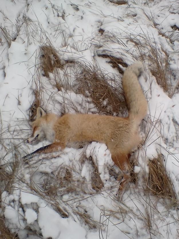 Открылся по пуху. Не так как хотелось бы. Косому сбежать помогло малое количество снега в траве. Кумушку выгнали с голосом на меня 4 дворняжки