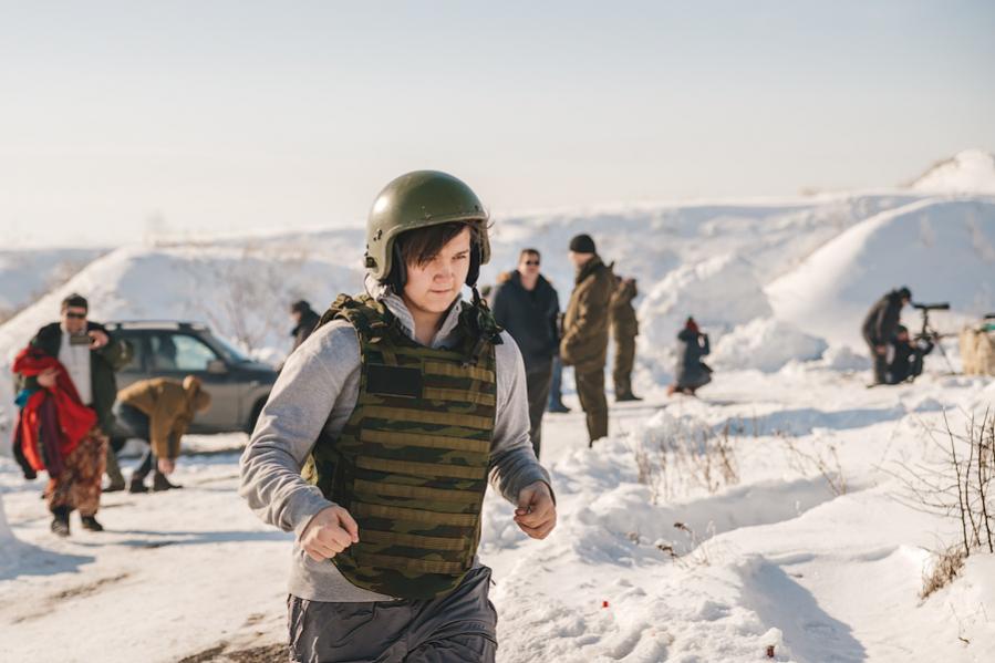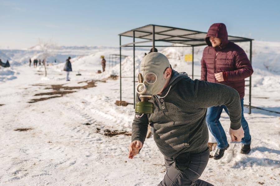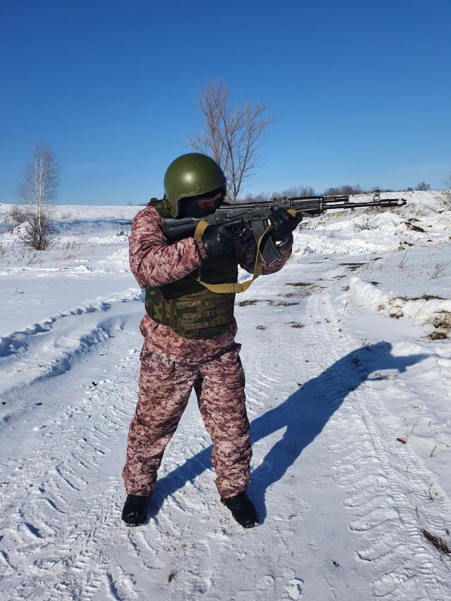 Затем участники надевали тяжелую каску спецназа, армейский бронежилет, бегом на следующую позицию, где надо было снарядить АК и отстреляться стоя, с колена, лёжа.После чего, надев противогаз, прибежать в другой капонир где отстреляться из ПМ сильной и слабой рукой.
