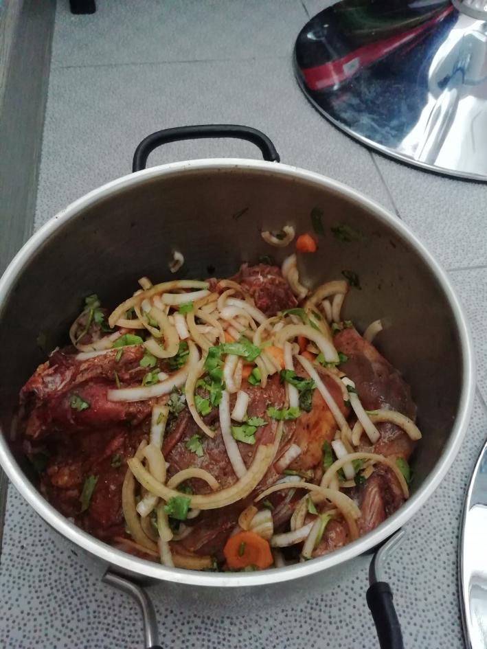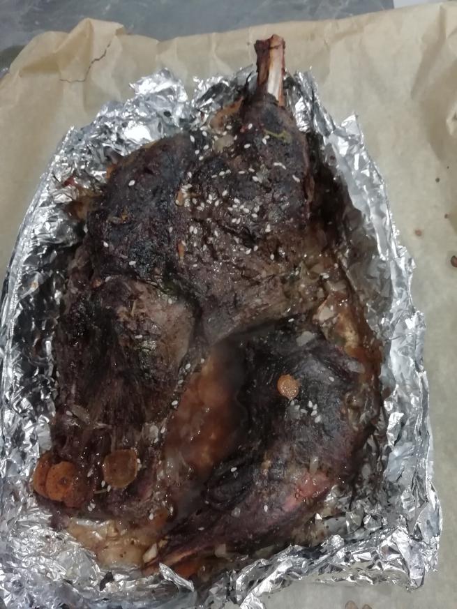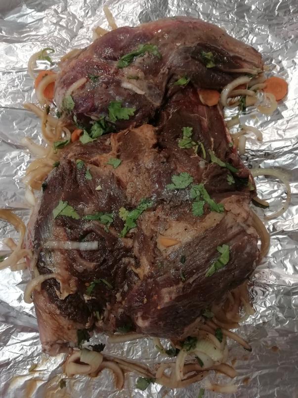 И так, бобрик в духовочке. Отмочил мясо 20 часов в холодной воде с уксусом на балконе. Далее 4 часа в маринаде - соевый соус, лук, малясь морковки, нашпиговал чесноком, поперчил и приправ из китая плюхнул. 2 часа при 180 и 20 мин при гриле.