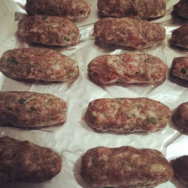 Жирненький кабан - хороший фарш - значит котлетки, пельмешки и люля-кебаб. Итак, люля-кебаб в духовке: Фарш, соль, перец, петрушка, укроп, чеснок и лук... Хорошенько перемешать и в холод на несколько часов. В духовке не то конечно, но вкусно, всем понравилось! Минут 30 наверное и кушать подано!