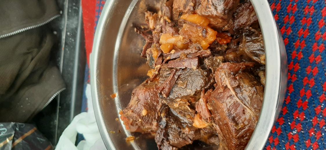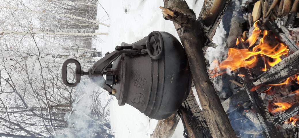 Замечательная приблуда - Афганский казан простаивал без дела. Решено: в дело его! На дно нарезал сальца кусочками. Мясо крупными кусками говядину и баранину. Туда же: лук кольцами, картошку тонкими кругляшами, шампиньоны пластинками, помидор колечками. Соль, специи и бутылочку темного пива. Закупорил казанок и с собой. Все гермитично, ничего не прольется. Подальше от Новогоднего города... Погода песня, накатались, накопались. Пора к обеду. Лопаткой выкопал снег, поломал дровишек, соорудил подставочку из трех длинных сушин. Костерок сначало лениво, но со времен все ярче набирает обороты... Пора. Сверху над огнем водрузил Казан. Пока то да се, пошел парок из клапанов, убавил пламя, чутка потомил и к столу. Давление спускаем через клапана, крышку прочь. И вот он момент истины. Мясо на стол! Ну что сказать мясо имеет свой оригинальный вкус, тает во рту. Всем добра и новых кулинарных открытий!