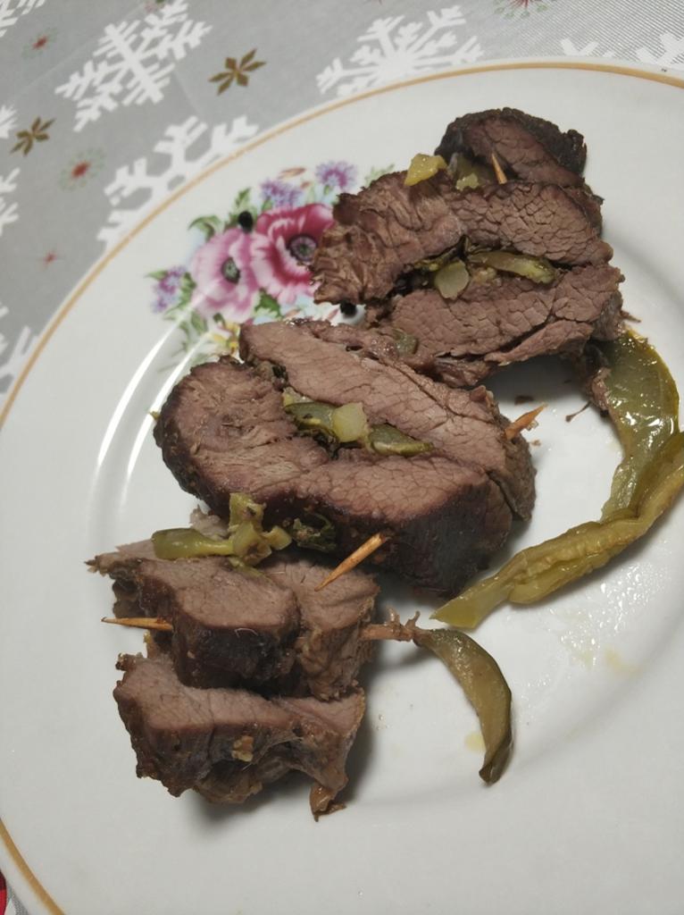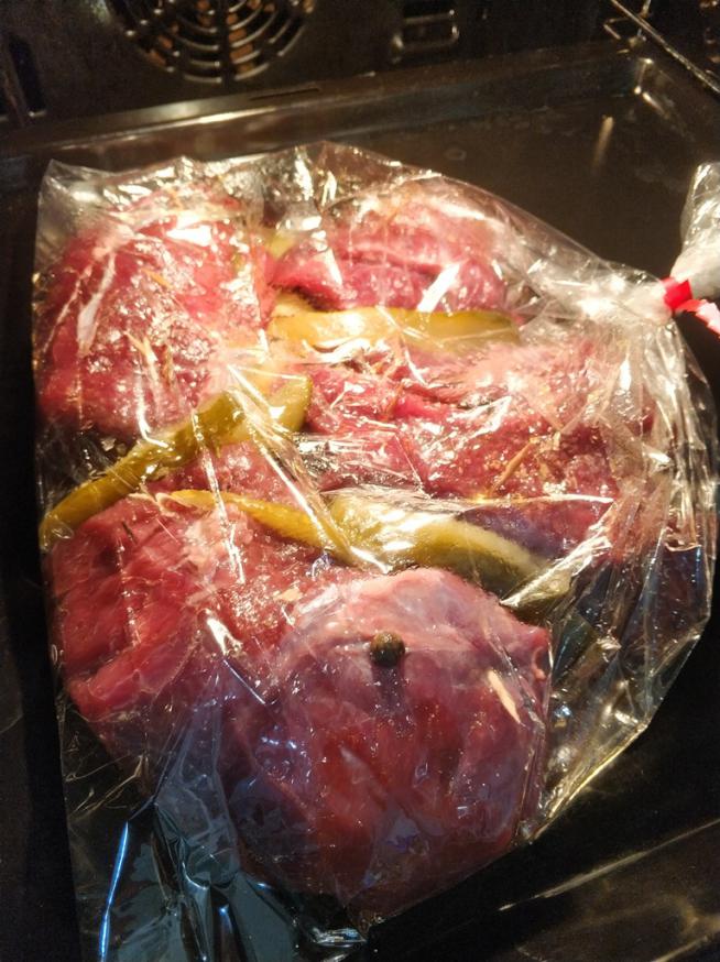 Эх, расскажу, вроде после обеда...))) Лось по особенному. В общем кусок лося разделил на порционные куски, но большие, грамм по 350-500. Вдоль надрезал, посолил, поперчил, положил по чуть розмарина. Далее достал маминых огурчиков, порезал. Свиное сало настрогал из морозилки и мелко порубил (очень важно, т.к. мелкие кусочки практически растворятся, а жирнота мяса останется). Все это уложил на мясо и сложив его пополам закрепил зубочистками. Тушил в пакете, в который добавил две столовых ложки рассола из банки огурцов. Время в пакете - 1 час, с открытым пакетом - 45 минут. На 30 минут оставил потомиться в выключенной духовке. Отличное блюдо для всей семьи, дети кушали на УРА! Всем приятного аппетита!