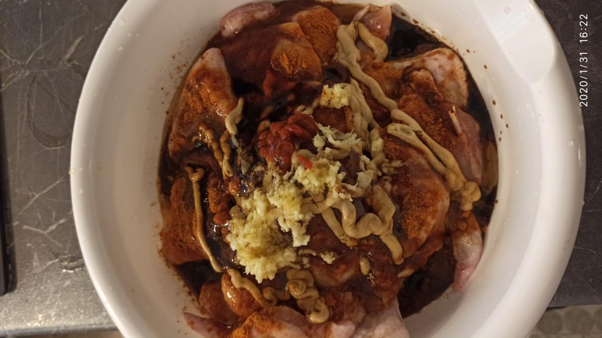 Берём крылья, добавляем: соевый соус, бальзамический, горчица, чеснок, соль, индийскую приправу, тунисскую аджику, карри и мёд.