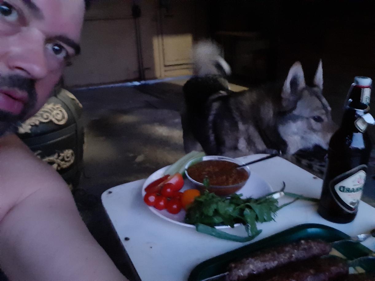 Фарш на крупной решетке, туда же курдюк, лук отжимаем от сока, специи ( кориандр, зира, черный перец) свежеобжареные и истолченые в ступке. Мега тщательно вымешиваем, что бы там какой то белок, куда то, чего то отдал. По факту консистенция должна быть как вязкая глина, поднимаешь руку а фарш не отстает от ладони. Все в холод. И дрова в мангал. Угли готовы, шампура и немного вспомним уроки лепки из теперь уже кажется, так далекого детства... Ставим на мангал и пошла жара. Не ленимся крутить вертеть, чтоб румяная корка была равномерной со всех сторон. Готово! Соус. Отдельная история. Взял Буздякский "Татарский", палитра специй уж больно по вкусу, но это на любителя, свежие лук репчатый, кинза, петрушка, красный перец, в блендер, туда соус, минута и готов соусок. Немного свежих овощей, зелени и бутылочку холодного пивка... Всем добра, тепла, здоровья! |