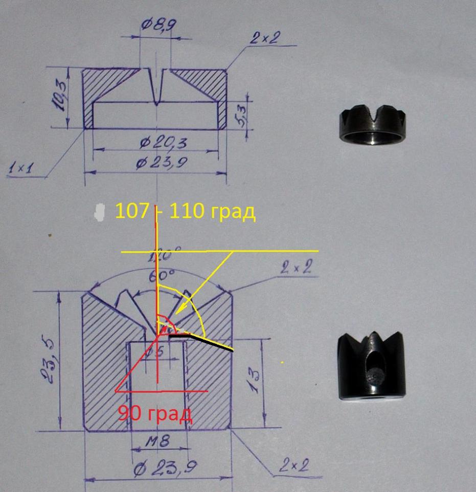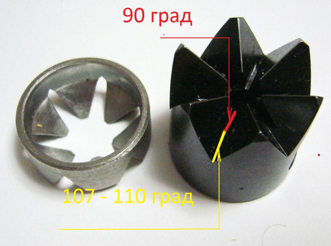 Зубья режутся фрезой под углом в 107-110 град относительно перпендикуляра матрици до центра. Затем, после завершения нарезки зубьев, междузубье торцуется под прямым углом до половины проточки ( 107 - 110 град) относительно центра. Схематично показал.