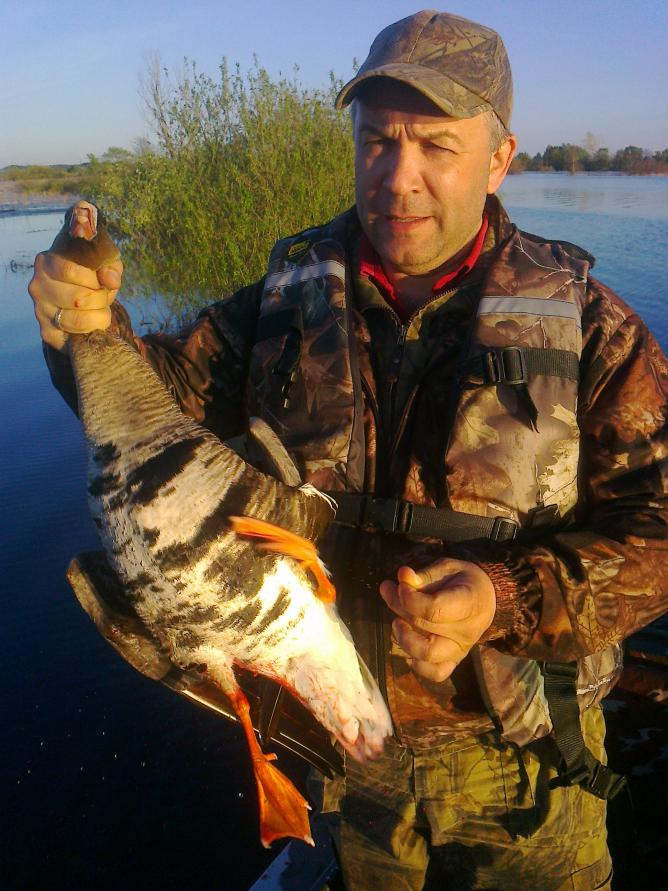 Всем привет. Все-таки догнал я своего гуся , который на меня "ХЫТРО смотрел" в Кировской области. Был там в начале мая в командировке, товарищ предложил на денек задержаться, организовал охоту. Охота очень своеобразная, совсем не как у нас, до места шли на моторке часа полтора перелетая небольшие куски суши, кустов, топляков и прочего. Преодолев последний порог, выехали на разлив Вятки в лугах. Красотища: кругом вода, море-океан ) Практически сразу услышали гусей на воде. Пока перекусили, да по 100 боевых, гуси поднялись дружно и ушли на кормежку, оставив нам на растерзание одного подранка. Мы в это время на позиции, я и один из моих товарищей на лодках да по кустам в 500 метрах друг от друга, а остальные втроем на моторке тоже примерно на таком расстоянии от нас, треугольником короче. Прошло часа полтора, намека на то, что гуси вернуться даже не было, ни разведчиков, ни далеких стай. Прошло еще полчаса и началось такоооое!!!!!!: со всех сторон, одиночки, пары, стаи штук до 30. Вот сколько глаз видит - со всех сторон. Но, надо отдать должное, бдительность они тоже не потеряли и поэтому на выстрел долетали только единицы. Война стояла с полчаса, когда почти стемнело гуси садились не стисняясь в 100-200 метрах, почти не обращая на выстрелы. В целом все было очень похоже на открытие утиной осенью в каком-нить хорошем охотхозяйстве. Результат данного мероприятия следующий: 6 белолобых (включая подранка, которого добрали вначале охоты) и 6 гуменников, причем 4 из них были невероятно больших размеров. Всё, закрылся, успокоился!!!