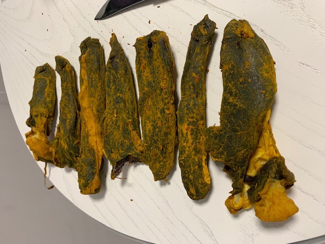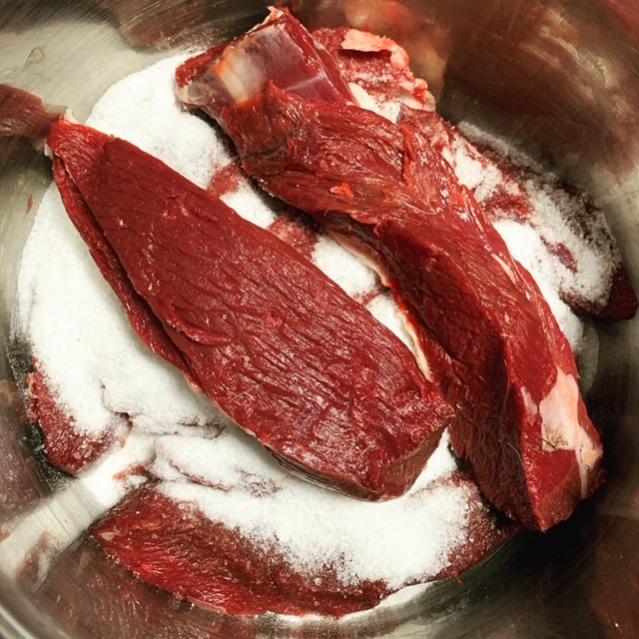 Добытый козлик оказался упитанным и даже жирным. Заднюю ногу на бастурму. Захотелось не обычного маринада. Основной приправой для бастурмы считается – Чаман, я его тоже использую, но в этот раз поступил так: мясо кусочками-брусками 3-4 см на 5-7 см укладываем на подушку из соли и засыпаем полностью каменной – крупной солью. Мясо даст сок, который лучше бы сливать и досыпать сухую соль. Солилась таким образом трое суток. После промываем холодной водой и отмачиваем 6 часов в холодной воде, периодически ее меняя (я пять раз менял). Обсушиваем с помощью бумажных полотенец. Занимаемся маринадом специй для обмазки бастурмы! Внимание специи: куркума, острая паприка, копченая паприка, прованские травы и зира (прям как в плов растираем ее), водички туда, перемешиваем и пусть тоже настоится минут 20.