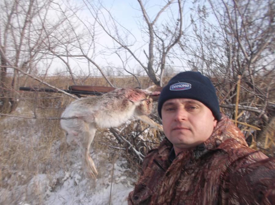 Наконец то открылся. Да к тому же очень к стати- завтра у бати Днюха 71 стукнет. Будет подарочный тушёный заяц. А началось всё так. В 8-00 я уже в полях. Ещё в сумерках нахожу след и давай по нему тропить. Обошёл жировки и нашёл выходной , но прямо в бурьян высотой 70-80 см. След то и дело теряется, но я его упрямо ищу.Пролазил я так метров 300. Как вдруг слышу -зашуршало впереди, но не видно не хе.а. И уже только метрах в 40 начала появляться над бурьяном и тут же пропадать ушастая голова. Отстрелял 4 патрона в надежде попасть в выскакивающую голову. Но увы. Прошёлся по гонному следу в поисках крови -но нет не попал.Сошёл с гонного и пошёл распутывать следующую жировку, благо их много. Кружился,кружился,ушёл в пашню,умотал он меня . Вижу ведёт он меня опять к жировке. Думаю -вот Змей. Закинул ружьё за спину и пошёл по заснеженной полевой дороге к машине. И вот он закон подлости когда ружьё за спиной. Оказалось что я не дошёл до лёжки каких то 20 метров. Заяц вылетел из придорожной травы как торпеда метрах в 10 от меня и понёсся прямо от меня по дороге. пока я скинул ружьё, пока с предохранителя ,пока выцелил -он уже метрах в 50. Первыми двумя мажу, а вот третим 00 пулумагнум(феттер)попадаю. Зая кувыркается через голову и начинает нагами ловить землю. И ему это удаётся , он вскакивает и давай дёру. стреляю зачем то ему в след последним патроном в стволе.Мимо. Бугу к месту попадания.кровь есть. А у меня всего один запасной патрон остался. Так как кровит сильно решаю передышки зайцу не давать. Так и вышло- зай пробежал метров 150 и залег в первой же высокой траве. Я за ним. Только сунулся в траву, как он выскочит в метре от меня и в пашню. И тут я совершаю свою любимую ошибку. Не даю ему отойти по дальше -луплю с 7-8 метров.Взрыв земли рядом с зайцем.Мимо. Но заметил что плечо у него всё в крови.Заяц пашню пересёк и опять в траву. А у меня патронов нема. Думаю может заяц там сам дойдёт. Выждал минут 15 и пошёл к месту куда зай сиганул. Достал нож для рукопашной на всякий случай. Заяц подпустил метров на 5 и опять через пашню в траву. Думаю -Нет так тебя не взять. Быстрее к машине и на всех парах домой за боекомплектом. Туда -сюда за 40 минут сгонял.Вернулся с 14 патронами. Ну думаю этого хватить должно. Оставляю машину метрах в 50 от последней скидки . Начинаю поиск , зайка уже успел свалить прилично. Да и ветер стал следочки передувать. Но заяц совершил ошибку- спустился в бетонный арык и по нему ушёл. К стати кровить уже парестал. Вылезя из арыка он скинулся в бурьян, где я его и нашёл.Поднялся он опять метрах в 3-5. В этот раз отпускаю метров на 15 и 0 магнум прилетает ему в затылок.Ура. Издаю крик Кинг Конга(оглядываюсь по сторонам не видит ли кто мою буйную радость) и довольный иду к машине. Больше всего рад что подранка не сгубил.