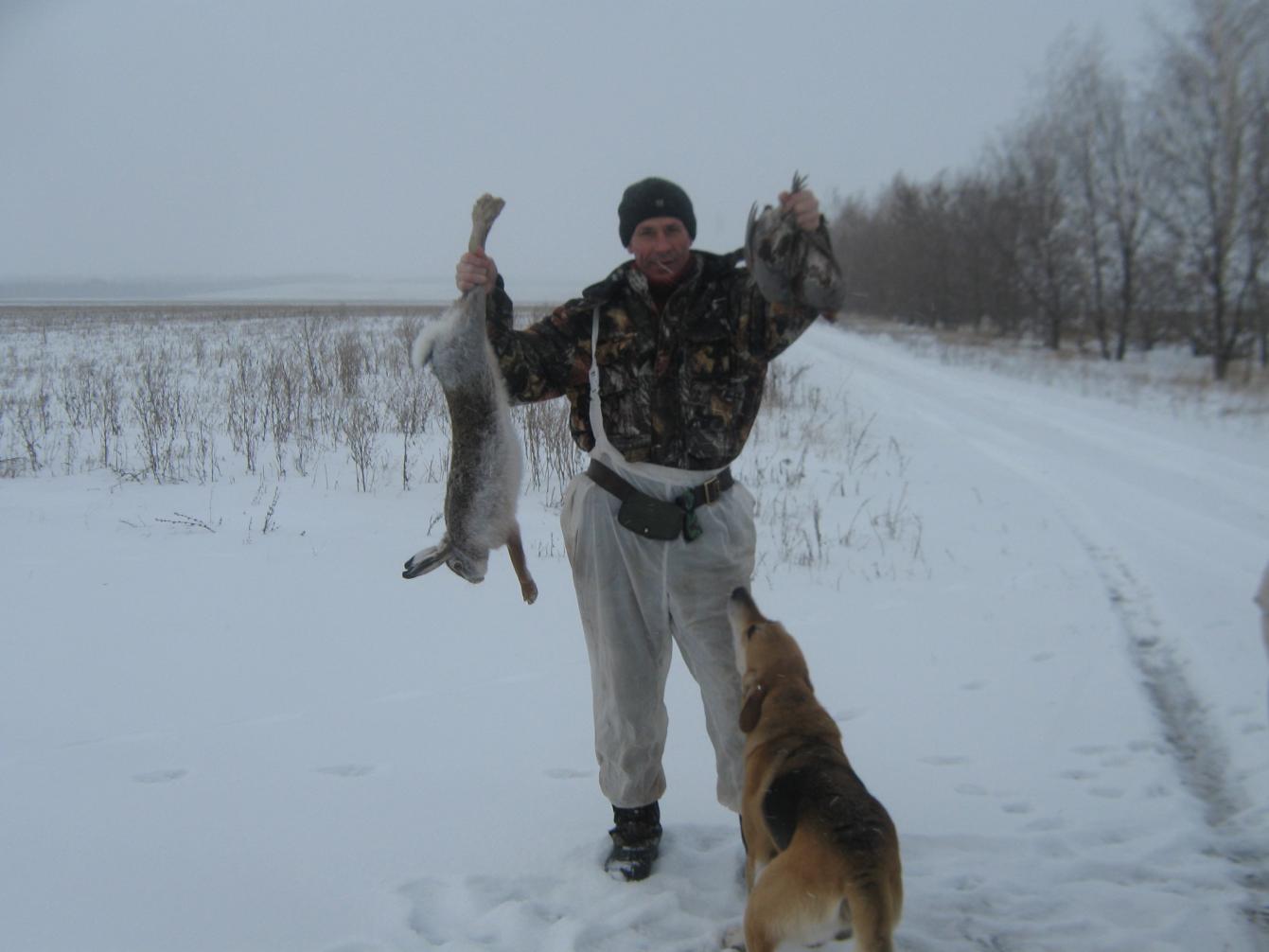 Сегодня были в "Любицком" хозяйстве, погода жуткая .метель .понизуха,в полях делать было нечего.Было принято решение ехать на границу "Любицкого"и"Берёзо Гайского" хозяйства .Кто в курсе ,знает там есть поля с чепыжом между посадок,там было немножко потише.Разошлись по полю ,примерно минут через 20 была побудка зверя собаками,по уже занесённым следам разобрались что это была лиса,так как в это время года лиса не кружит мы потеряли собак где-то часа на два. Всё это время пока не было собак мы прочёсывали чепыж.По истечении этого времени я услышал голос собак .он доносился со стороны соседней посадки.Примерно минут через 5 услышал два выстрела,оказалось, что собаки возвращаясь наткнулись на след шумового зайца.Заяц вышел на дорогу и шёл в направлении машины где был и добыт моим товарищем. А двух куропаток мы подобрали по трассе следуя за фурой. Несмотря на погоду охота удалась,получили большой заряд бодрости и инергии!!