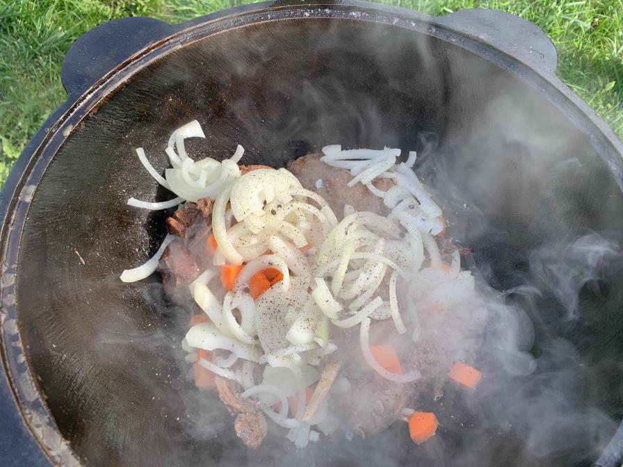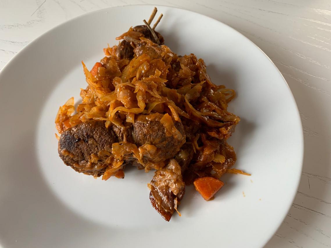 Рецепт: мясо обжарить на растительном масле в течении 15 минут, не до угольков ))) как показывают некоторые блогеры – просто обжарить до корочки красивой. Добавляем лук, морковку, солим и перчим – лук и морковка дадут сок – тушим с ними 15 минут. Далее выкладываем капусту квашеную, свежую и добавляем томатную пасту, добавляем 0,5 литра воды – тушим 30-40 минут. Периодически перемешиваем, огонь убавляем. После оставляем отдохнуть в казане в течении 20 минут и можно подавать.