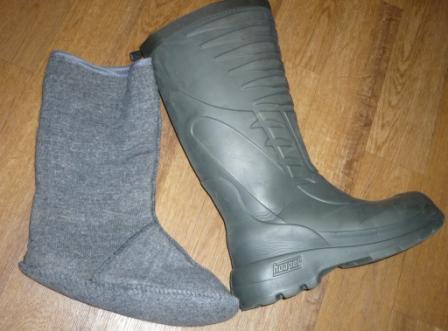 До - 10 хожу в сапогах из вспениной резины Hooper, очень легкие и теплые, особенно удобно по весне на гуся, когда грязно и холодно (на птичке 1000р брал), На лыжах и когда холодно, на снегоходе пользуюсь "Вездеход" хорошие чулки из тонкого войлока, на шерстяной носок, есть шипы (тоже брал на птичке почем уже не помню).