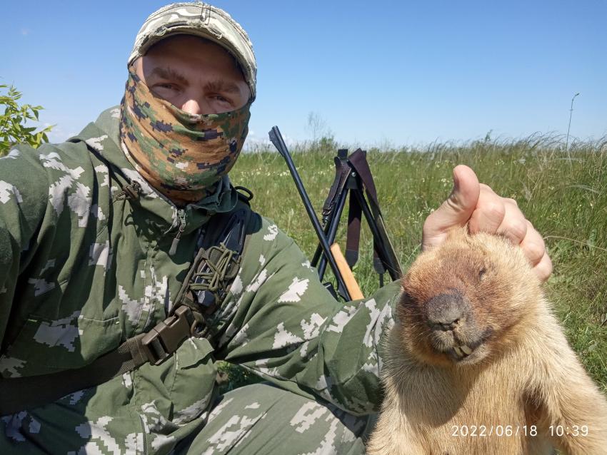 Выехал с вечера, в 12 уже был на месте. С фонарём осмотрел сурчины- свежие отвалы, тропки в траве-охоте быть! Летняя ночь коротка, пару часов сна и ночь отступает, сменяясь предрассветными сумерками. Бутерброды,чай и выдвигаюсь. Ещё раз осматриваюсь на месте- сурчины расположены полумесяцем, выбираю позицию так, чтобы доставать все. Тут как раз несколько подходящих кустов, солнце будет вставать за плечом. Аккуратно подрезаю, несколько веточек что-бы установить трипод, узкая полоса для наблюдения и стрельбы, остальное- моя маскировка. Ждать пришлось пару часов- слоистые облака лежащие около самого горизонта наконец-то отпустили солнце из своих объятий и оно осветило землю. Штуцер лежит на триподе нацелен на центр полумесяца- там самая крупная сурчина с большим отвалом камня, но столбик замечаю периферийным зрением на самом краю полумесяца, там где он вплотную подходит к полю. Пока вожусь триподом и стулом, разворачиваюсь с сторону сурка там-же появляется второй и третий. Успокоились, начали питаться. Дистанция 120, выбираю самого упитанного, дожидаюсь пока он встанет осмотреться. Выстрел разрывает тишину, сурки скрываются за травой. Уже на бегу вижу рыжий клочок-есть! 30 метров до сурчины, как-то странно лежит, то-ли лежит то-ли полусидит. Уже начинаю вскидывать но нет, не надо разбивать тушку-успею! Не успел. Даже не успел заметить когда он юркнул в нору. Есть кровь, булькающий звук из норы, похоже лёгкие. Подгоняю машину, в багажнике 2-х метровая пружина. Попытки зацепить зверя пружиной не приносят успеха. Жаль напрасных мучений зверя, потерянного трофея, но значит не мой. Нужно учиться стрелять. Переехал на другое место. Сурков заметил в бинокль издалека. Пробую с подхода. Прячась за извилинами дороги и буйным разнотравьем подхожу метров на 100. Так, трипод на изготовку- выстрел. Поторопился, не успокоил дыхание. Осмотр сурчины подтверждает промах. Здесь нужно ждать. Вот подходящая полоса густой обронки, куст татарника, сурчину будет видно хорошо. Ноги трипода на минимум, прилаживаю штуцер посмотреть подходящая-ли высота. Опа! А вот и он красавчик, то-ли совсем наглый, то-ли вовремя я присел за куст. Ты мой и точка! Вдох-выдох, вдох-выдох, крест на то место, где сходятся ключицы. В уже поднимающемся от отдачи прицеле вижу попадание-сурок опрокидывается навзничь. Рву когти к норе-есть, вот он красавчик. На сегодня хватит, делаю пару фотографий с трофеем, разделываю, жир под сопло кондиционера и возвращаюсь в город.