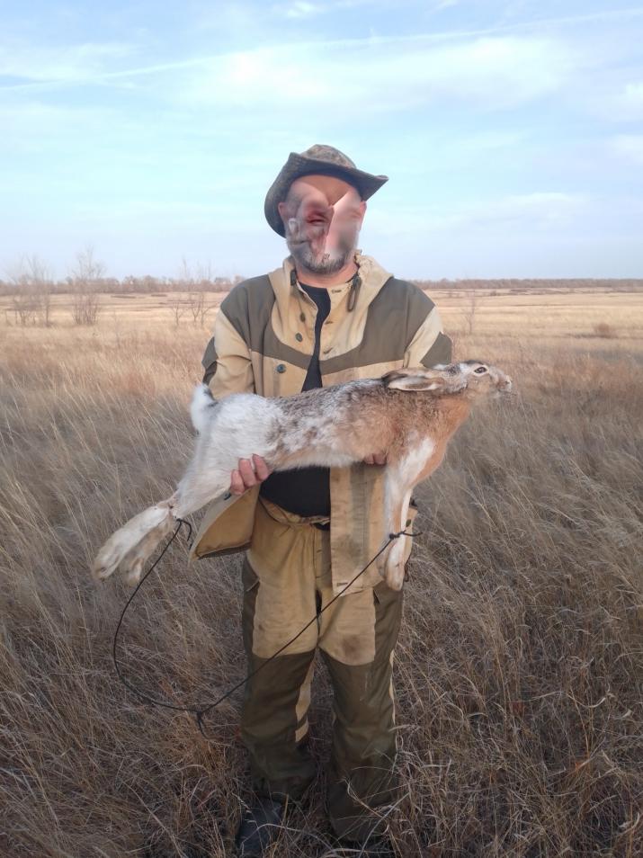 Новое-старое место меня удивило палом. Половину старой травы сожгли, выкорчевали поросль, а из земли пробились сочные ростки новой травы- заячье лакомство. Вот в этом месте я и начал искать зайца. Искал в не сожженном ковыле. И нашел. Заяц меня пропустил и встал слева сзади в 5 метрах из под маленького деревца. Звук подъема я слышал, но пока сориентировался, пока увидел скользящего по траве зайца- расстояние было уже метров 40. Стрелял в угон с 45-50 метров. Целил между ушей. Опять "3" , но теперь бесконтейнерная из "чока". Первым выстрелом в голову. Заяц сделал кульбит и стал кувыркаться через готову(так всегда, когда в голову). Добежал до него и "успокоил". Вес 4300гр.