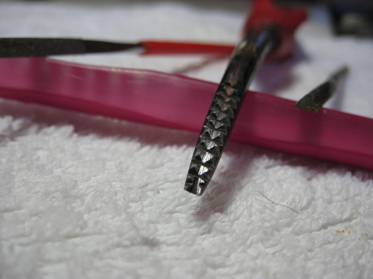 Можно всё сделать обычным треугольным надфилем,можно изготовить специнструмент из обычной отвертки. Старую насечку попытаться почистить как вы делали и аккуратно по старым линиям,но не на всю глубину, а постепено.