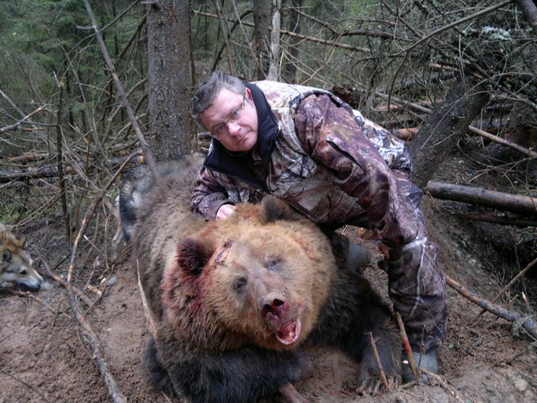 Друзья ездили в Киров ,в загоне собака нашла берлогу егерь подошел к ней и от туда выскочил мишка чудом.... успел всадить по метсу так сказать магазин упал в метре отзагонщика, 2,4 м от хвоста до морды вес чистого мяса 240 кг получилось,но мясо пришлось сжечь...... заразные сцука они там,шкуру отвезли на выделку 10 рублей на фабрике привести в благородный вид