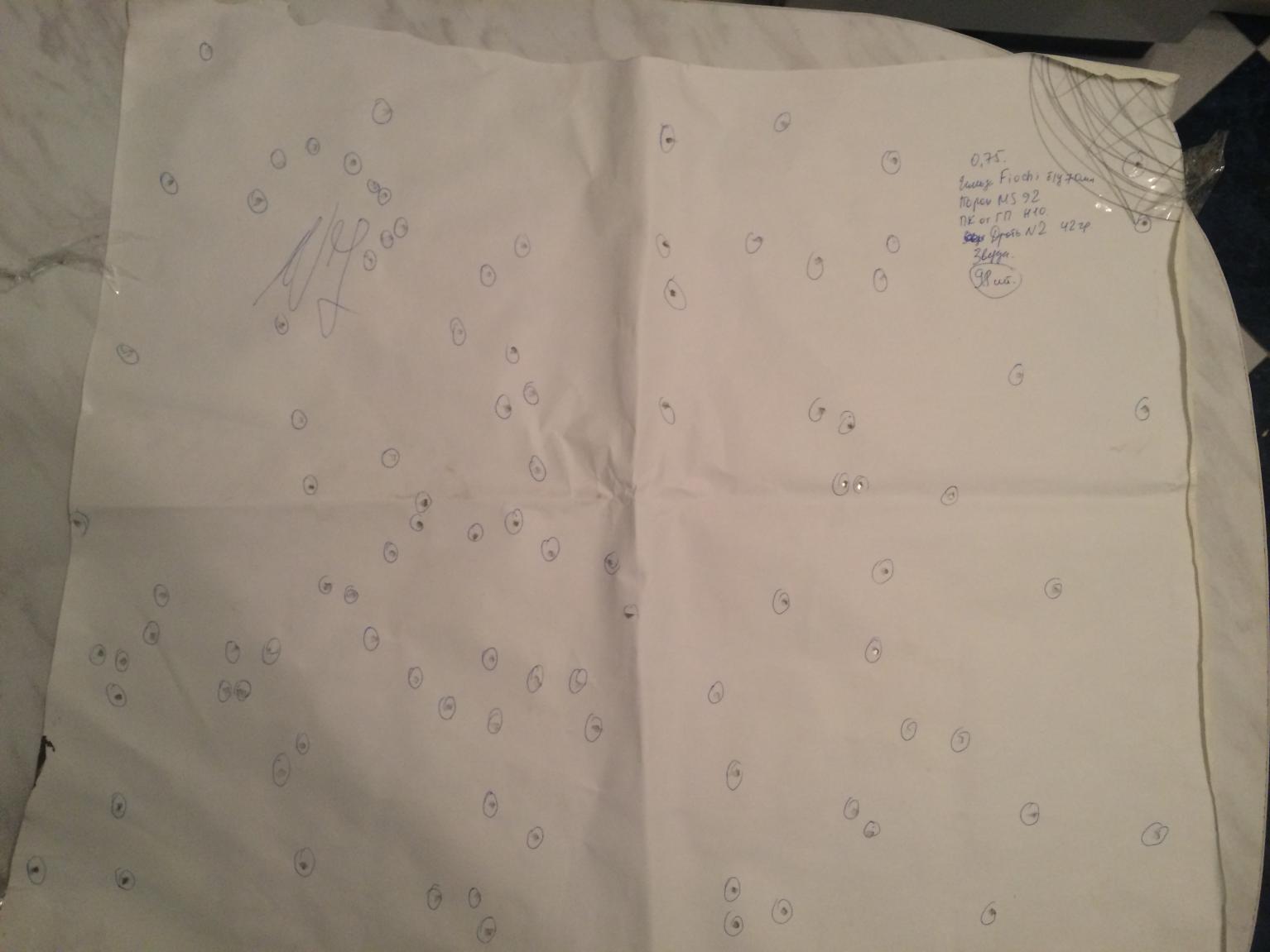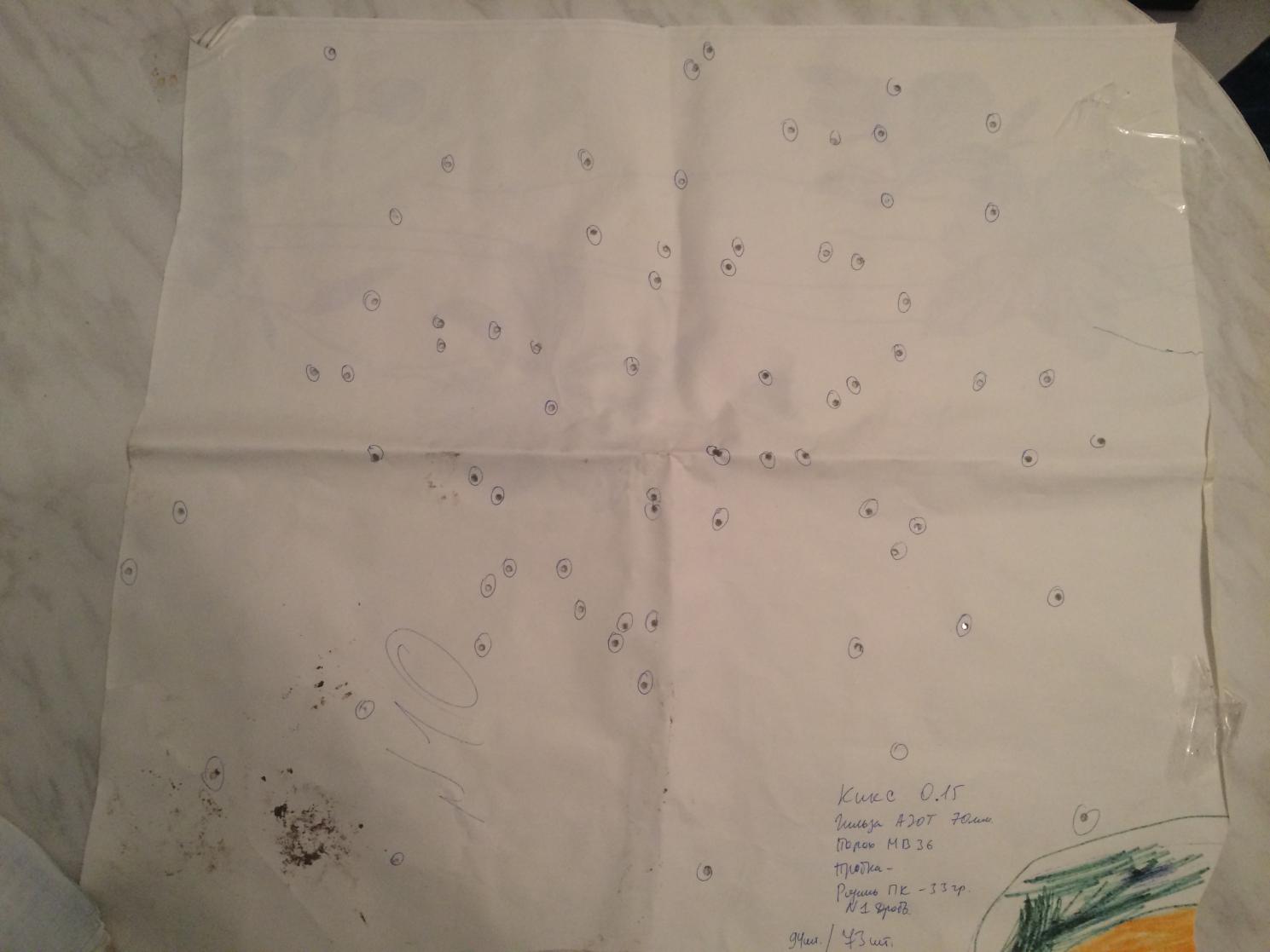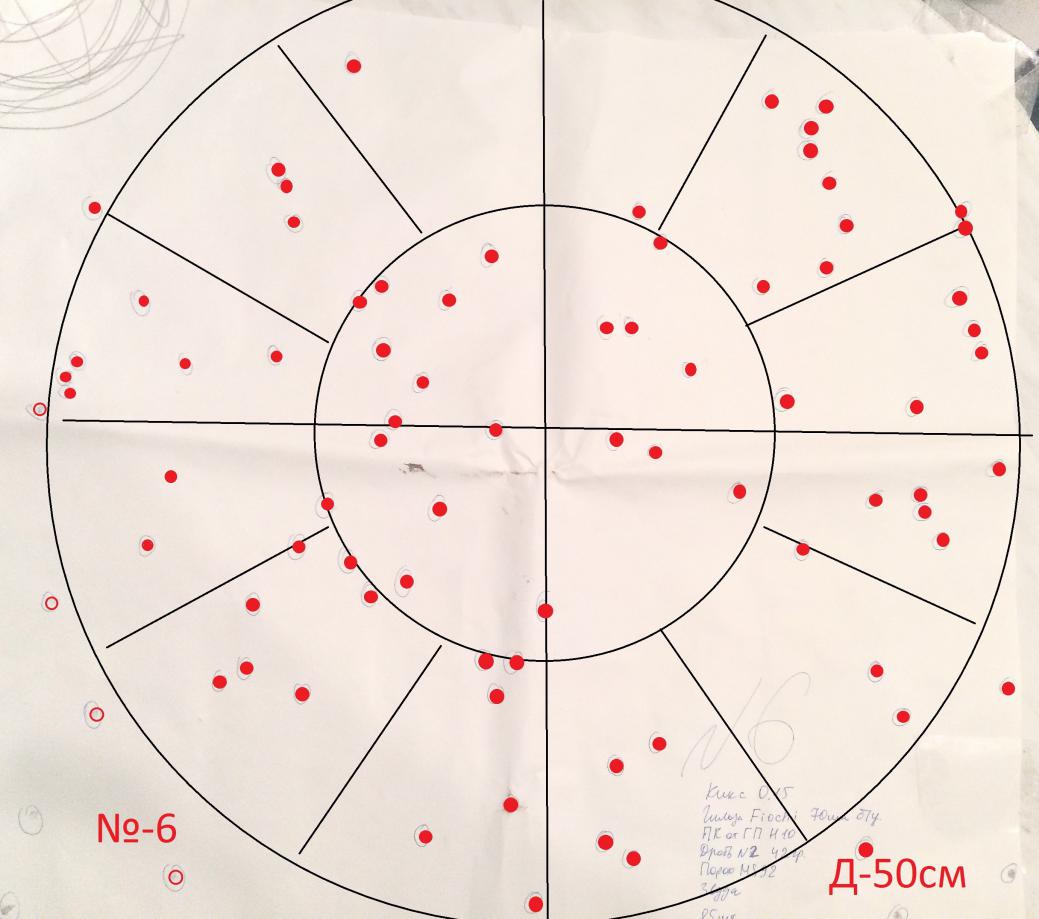 Вот отредактировал мишеньку от Егора (Варяг), результат теста патрона дробь 34г. №2 (109шт.) и собранного на порохе Драго (Нобель). В мишени диам. 750мм, 90шт дробин.