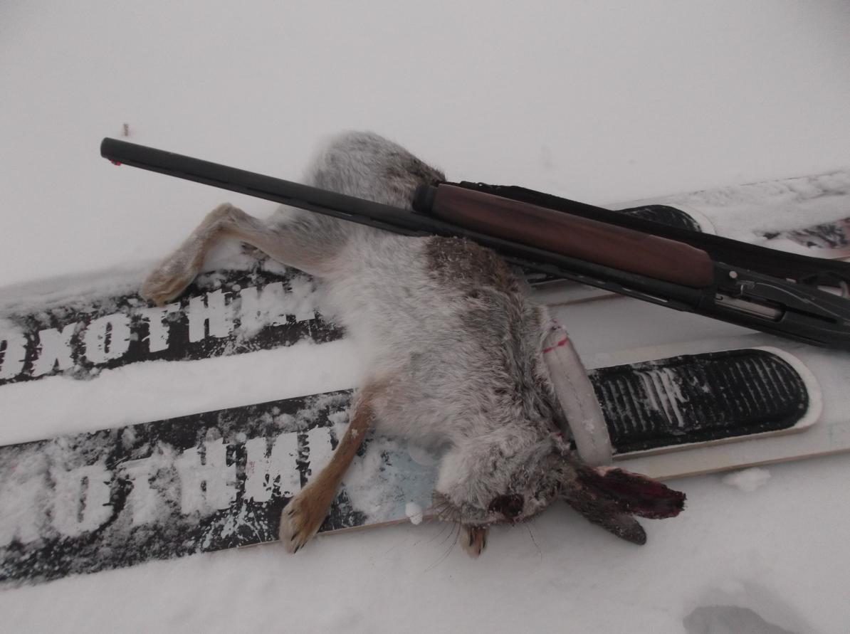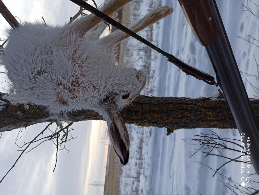 Всё таки я добрал позавчерашнего подранка. И поднялся он в 100 метрах от прошлого раза. Опять метров на 7-8 подпустил, но убегал прикрываясь кустообразным карагачём. Но ихняя косоглазая анатомия уводит зайцев с прямой в сторону. И вот заяц начал забирать в лево и показался в прицеле. А я уже был на 100 % готов. Метров 30-35 и одним выстрелом заяц добыт. Начал кувыркаться и крутится , но я уже учёный такими выкрутасами, стою и держу его на прицеле. Ну вроде всё успокоился , можно забирать. Стал его разглядывать , одно попадание в ляжку и одно в затылок. А правое ухо всё в запечёной крови, по этому то я и думаю , что это мой знакомый. На душе даже полегчало. А на охоте я был всего то 15 минут. Положил зайца в багажник и прогулялся просто так, что бы на будущее лыжню проложить киломатров на 5-6.