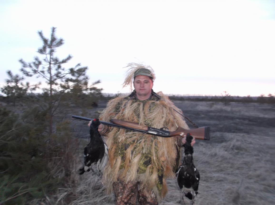 В этом году охота на тетерева в Ульяновской обл. не получилась. В пятницу у нас в Самарской и у соседей в Ульяновской погодка была нормальная. И я рванул в гости с надеждой на утренний ток субботы. Шурин уже ток разведал и приготовил шалашик. Засыпал с вечера с трудом, всё представлял как буду охотится. А проснувшись в 3 часа чуть не завыл от досады. Дождь поливал как из ведра. Ехать охотится смысла не было, тетерев не утка -в лужах веселится не будет. Дождь шёл весь день,так что пришлось возвращаться домой не расчехлив ружья. А в прошлом году взял двоих наблюдателей с тока. Сидели по краям и в бои не лезли , за что и поплатились. За прошлогоднюю фотку не ругайте строго-я на форуме полгода.