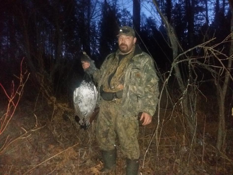 ***... Всё ещё темно, ни хера не знаем местность , ни хера не видно, но, типа, в ночи ориентиры заметили. Птички уже начали по темну орать, но идём... И тут сквозь этот ор- щелчки! Етить.. Слушаем- точно глухарь и там, куда указал Дед. Метров 300, бурьян какой-то по колено, ор птиц... Хрен подойдёшь под чувыханье. Идём как можно тише... Метров 150 остаётся и эта туша взлетает с грохотом... Я- бляяя, ну ладно, разведка... И тут глухарь облетев садиться на сосну в 50-ти метрах от нас, но сзади! И давай заливаться! Бро превращается в столб, я разворачиваюсь на 180 и начинаю скрадывать. Вроде темно, но по открытой местности. Иду минут 10, по шагу, расстояние метров 35, всё ещё не вижу, сосна густая... И тут мне прилетает подарок! Глухарь с грохотом перелетает на соседнюю сосну и теперь я его вижу как мишень "глухарь"! Под песню выцеливаю, жду второго чувыхыния и трофей!