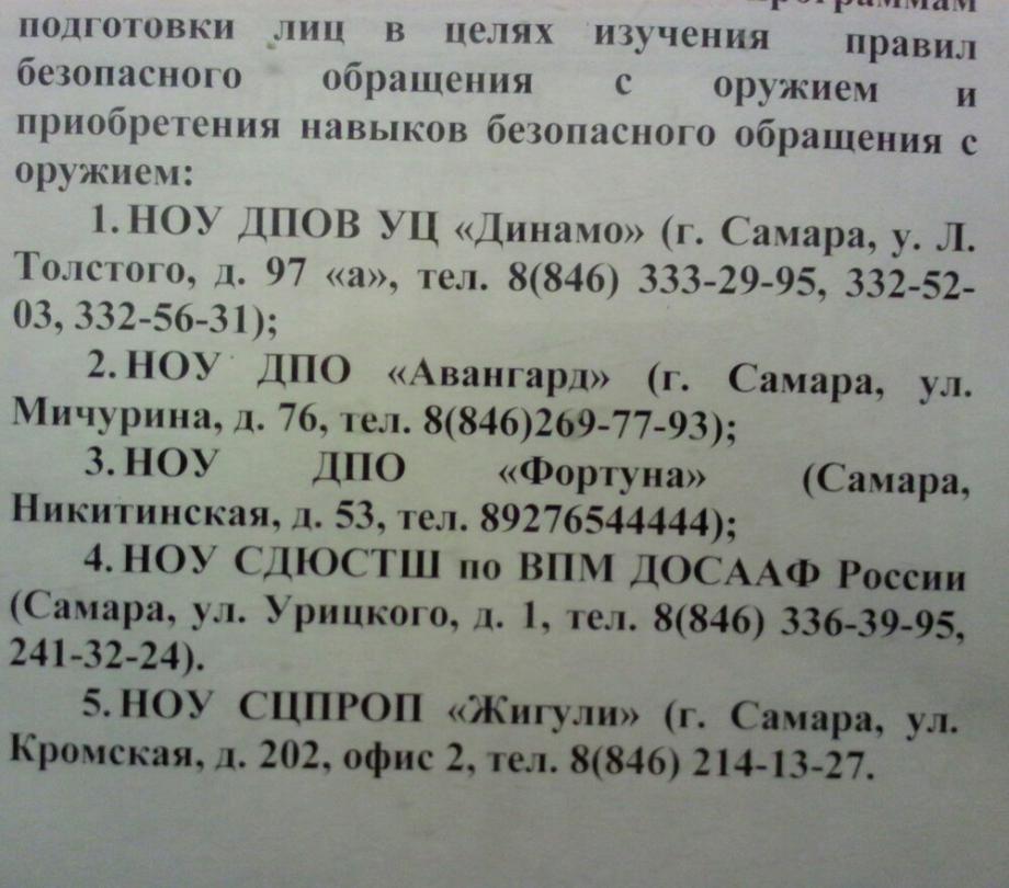 Вот адреса в Самаре,кому надо!На Динамо лучше не соваться....Хоть там на 1000 дешевле обещаютвсего 2500 .На зачётах вытянут за 5000!!!Пересдача 1100. Процент сдачи приблизительно 20-30%.Проваливают-огневую,причём и со второго раза не сдают. Теория на компе.Там..своеобразный инструктор по огневой!В остальных школах цена 3500 и 99% результат.