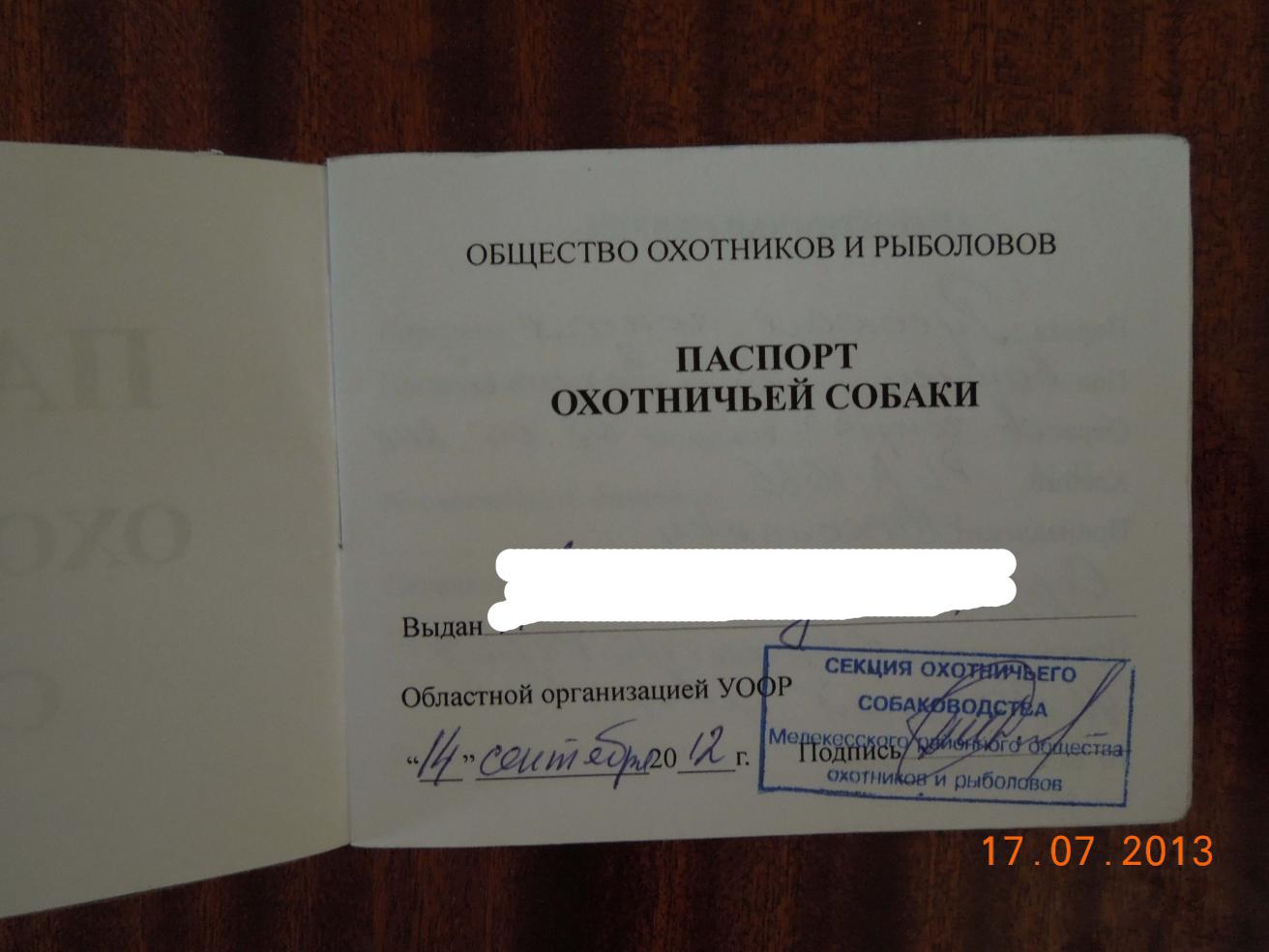 у нас по другому сделали-приходишь в охотобщество с документами на собаку (справка о происхождении) и с ветпаспортом, кинолог выписывает "паспорт", ставит штамп и дату "допущен к охоте".