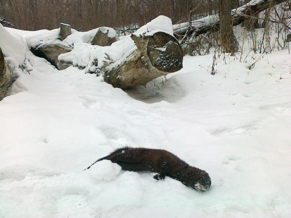 На днях на рыбалку ездил, был на Самарке почти в городе. Присек трапу норки и по ней пришел к логову. Удивил размер лапы зверька почти с лисью, да и след от хвоста большого. Походу здоровый кошак там живет.