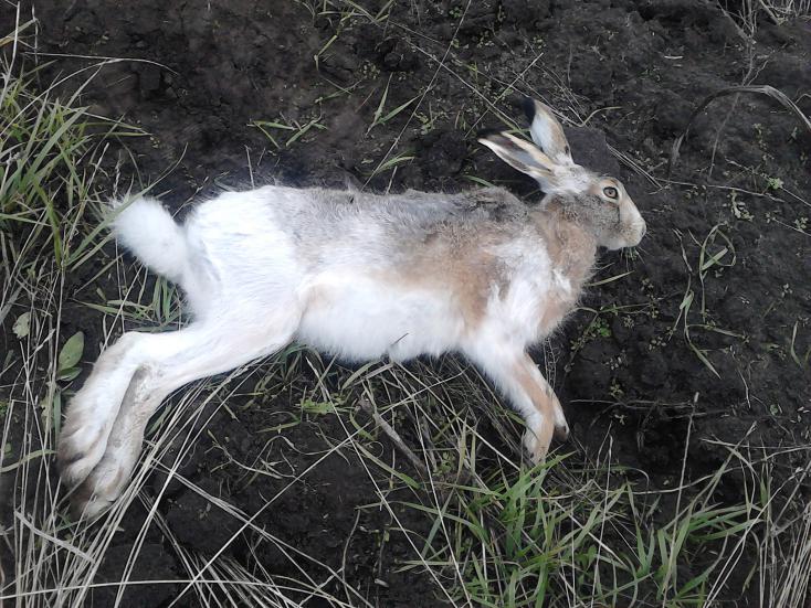 Приехали только что с охоты,находились в доволь,подняли двух зайцев одного на пашне,но он благополучно убёг,второй лежал в траве возле озимых,когда мы вышли из машины и хлопнули дверью то он поднялся и пошёл по озимым низинкой.Мы ему дали успокоится некоторое время и пошли по этой низинке,а он далеко и не убегал,прошёл метров 150 и запал в промоине,после подъёма был взят со второго выстрела.