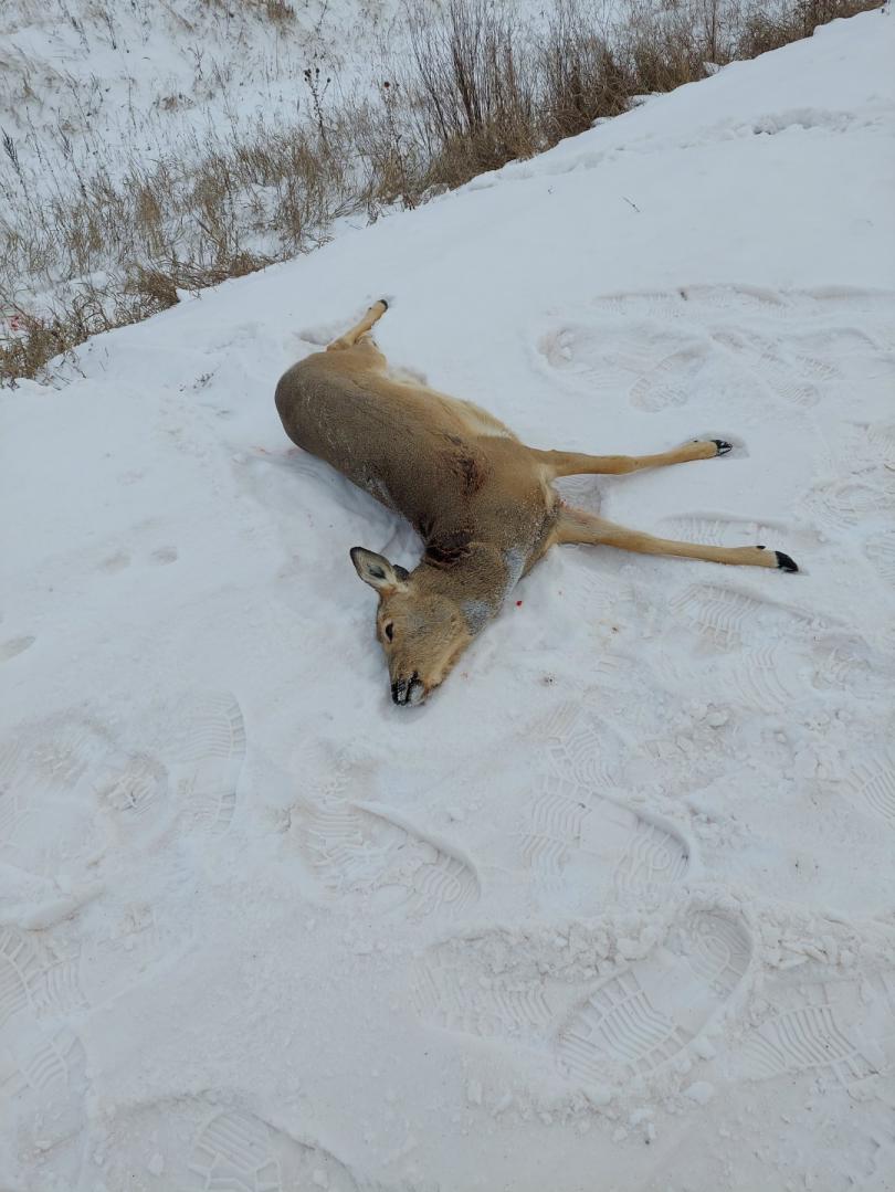 Хорошо, что деревья затормозили животное и мы приложив еще чуть усилий все таки вынесли его снегоходом из оврага.