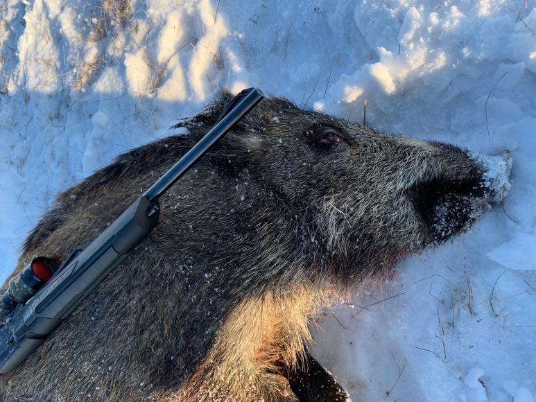 Дыхание и стук сердца участились… Упор. Красная точка коллиматора прошла по хребту зверя, обогнала до кончика пятака, толчок в плече… ВЫСТРЕЛ… Мелькание зверя сквозь деревьев прекратилось, он упал… ЕСТЬ! Ни с чем несравнимые ощущения! С полем! Дальше были выстрелы и разговоры по рациям, но я их уже не слышал… я тихонько пошел в сторону своей добычи…