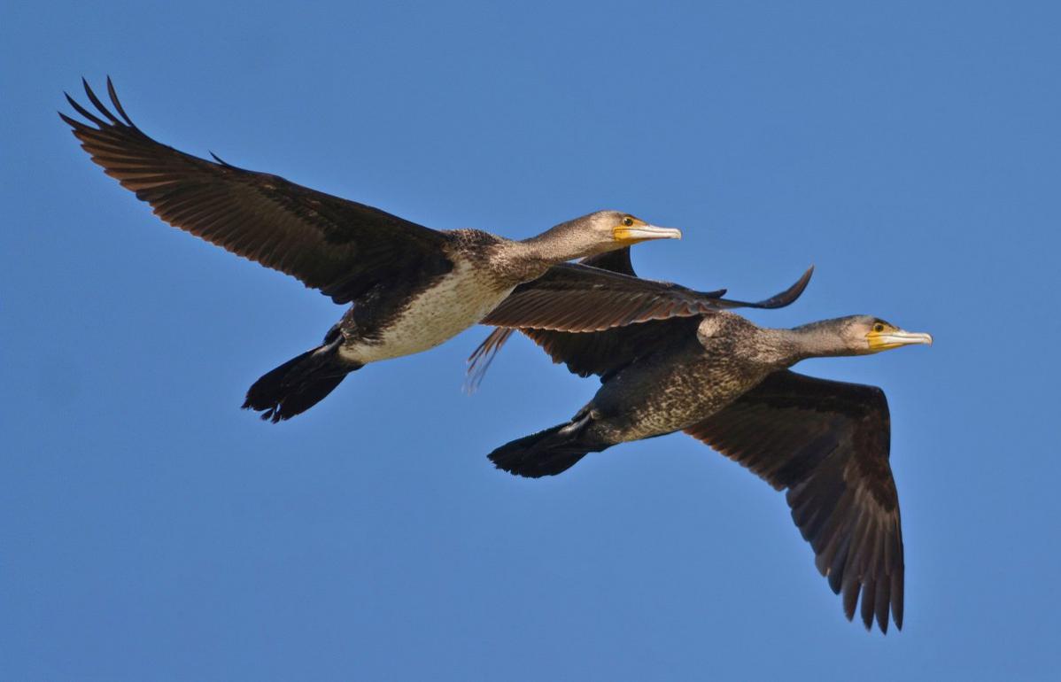 эти тоже умеют так летать (клином). Только у этих, как раз, лапки и видно, сзади торчат. У гусей, так сказать, лапки "за хвост не выпирают".