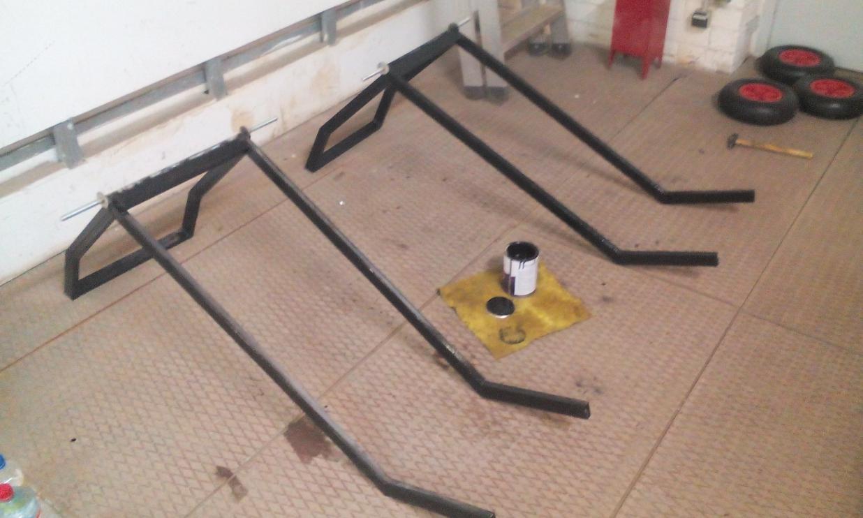 Давно уже хотел заиметь телегу для мотора. Привезённые Entuziastом рамы были обезжирены и покрашены в два слоя чёрной грунт-эмалью. Для крепления мотора закуплена ступенька 900х300х30 (как раз на две рамы).