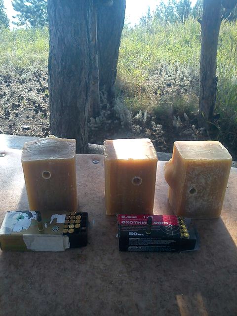 Небольшое пояснение: "Олимп - Э" - патрон, пуля которого, с надрезанным крест-накрест носиком (такой с завода), а Лапуа - обычные, целевые.