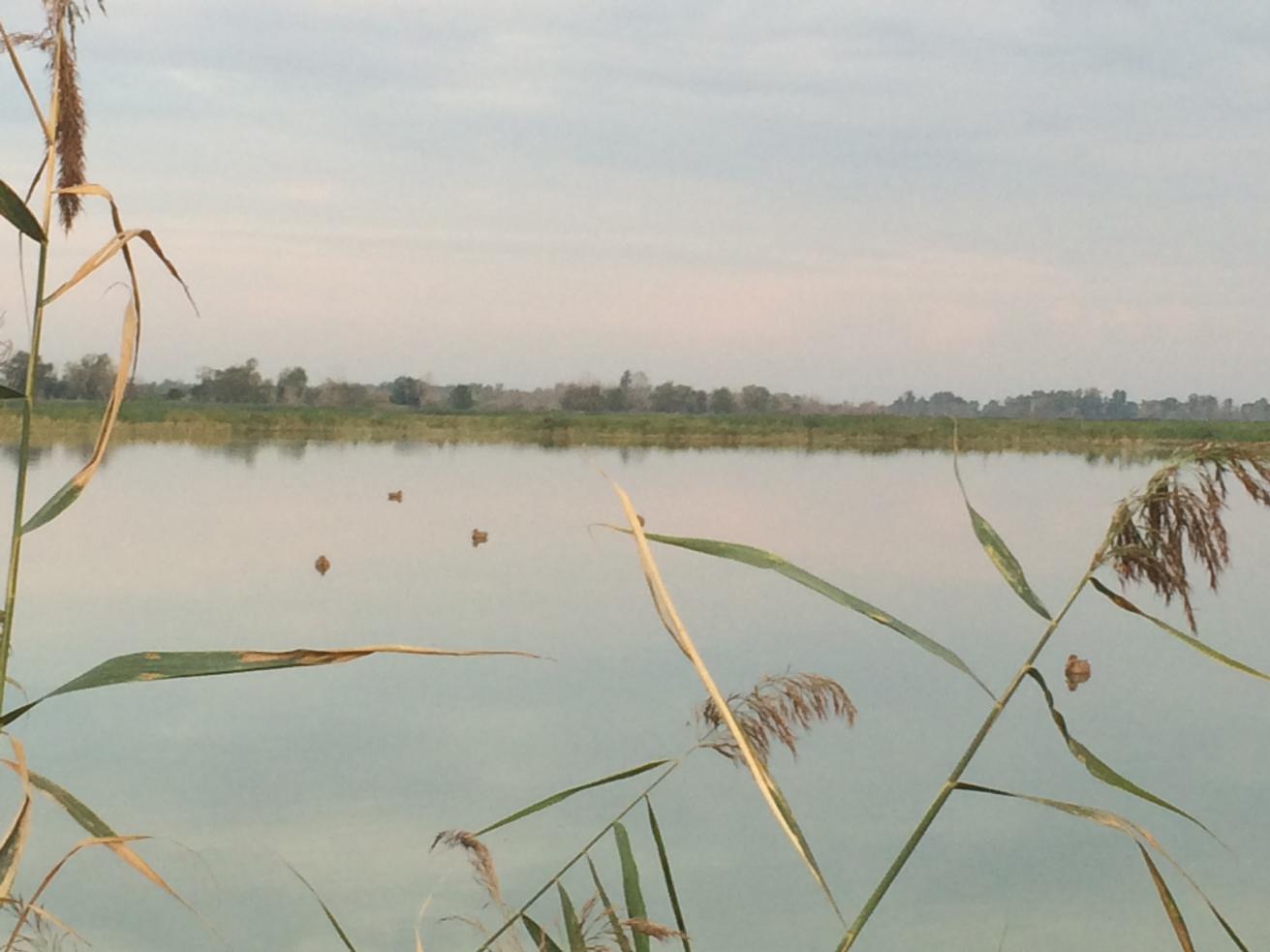 Вот следующее утро, утки заметно меньше, практически и нет. Соседи марку держат, фура с патронами еще не кончилась! Но тут и мы взяли 4 красноголовиков. Выгрузились берег, пошли смотреть следы вчерашнего танка. Следов нет, дорога сухая и твердая, борозда в камыше только осталась.