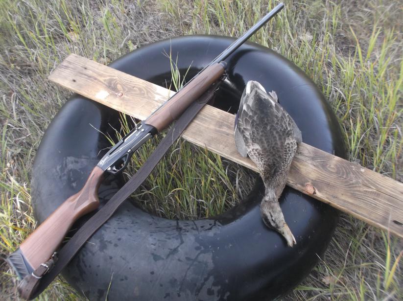 Сегодня из трёх поднявшихся крякашей взять сумел только одного. Хотя отстрелял 4 патрона. Снайпер из меня так себе, видать не просто так в армию в артиллеристы попал. Пока достал утю сто потов сошло. Воды в болоте сантиметров 5-10. Но в забродах уже около берега по пупок проваливаешься, на баллоне с места не стронешься. Так и пришлось , пол тела на баллоне , пол тела в жиже. Порадовало то ,что тушка совсем без костышей и дроби( попадание было 3 дробины в шею и одна в копчик).